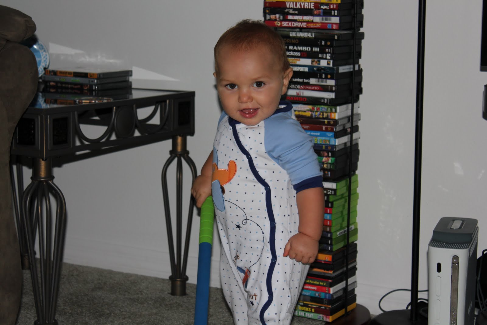 Do you see the DVD's in the holder behind him? He would go over to them and start pulling them out until his Mommy would chase him. He's quite the trip!!