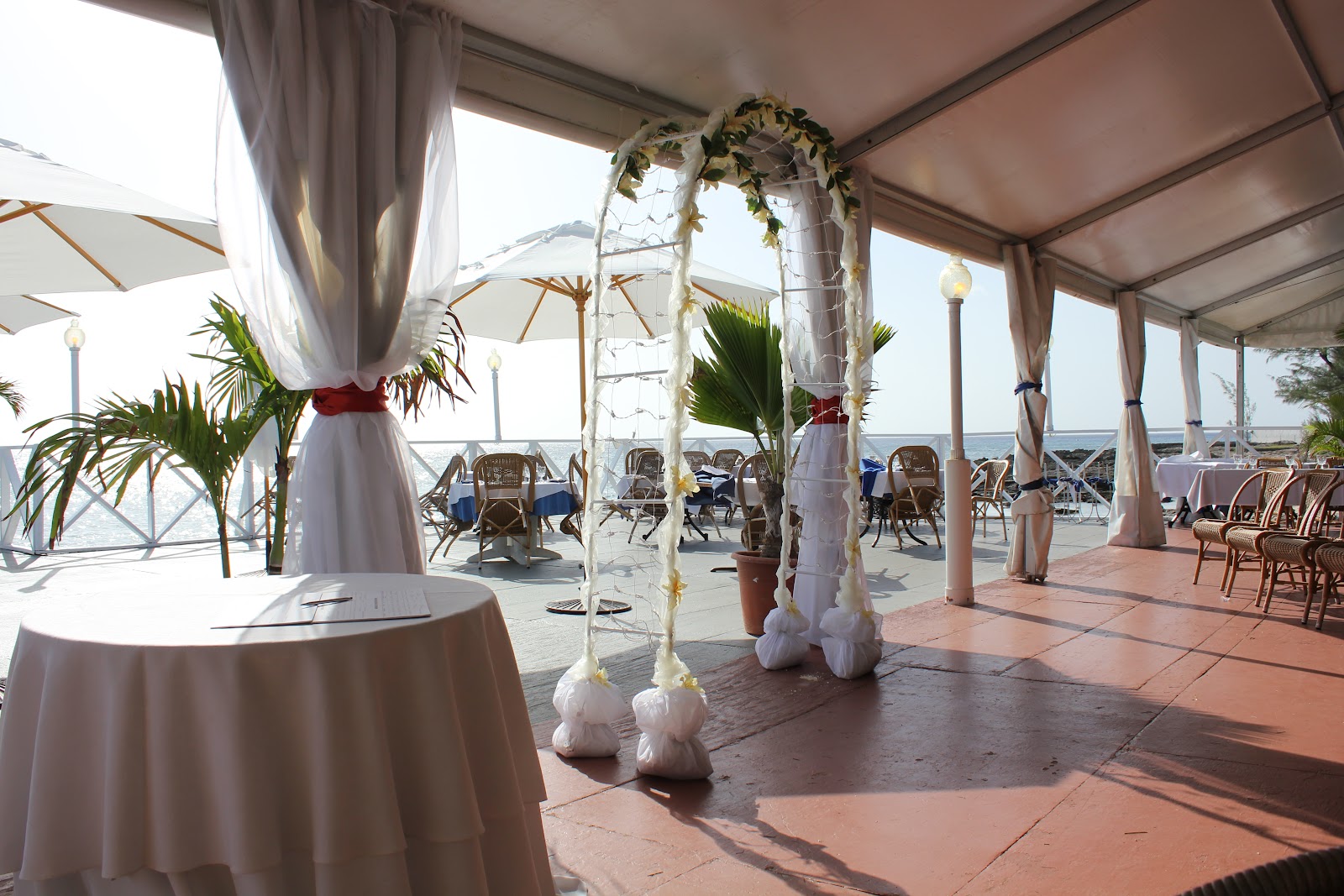 Yesterday, Saturday, June 9th, was a beautiful, bright sunny day here in Grand Cayman. Yes, it was really bright and sunny and very, very hot! Our good friend, Maureen and her fiance's wedding was planned for this day. When they had practice on Friday afternoon, the sun was shining and beating down so brightly that plans were made not to have the ceremony out on the deck at the Grand Old House, but under the large canopy area instead in the direct sun. When we got there everything was set up and so beautiful.